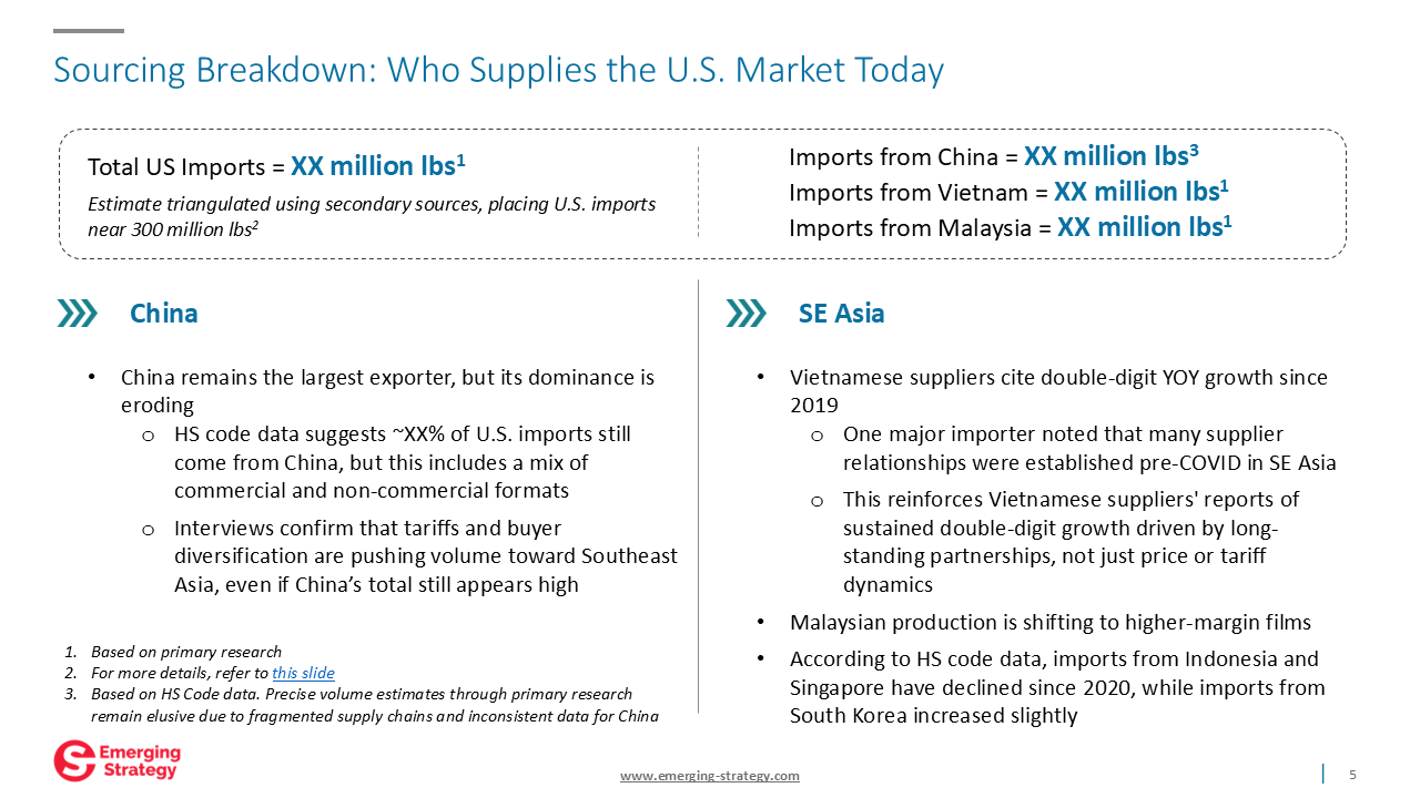 We conducted primary research with stakeholders across five countries to map out the real forces behind sourcing decisions, production shifts, and tariff responses. This report delivers insight into where the market is headed and what suppliers, buyers, and investors need to know to stay ahead.