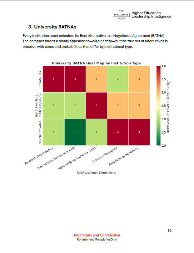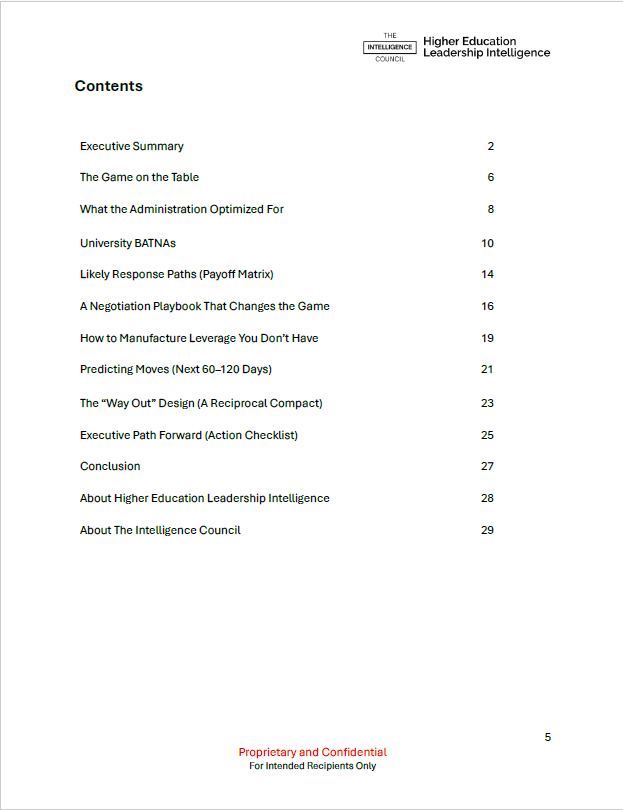 This Advisory Brief applies the tools of game theory and advanced negotiation science from the Harvard Negotiation Project, international bargaining case studies, and mechanism design in economics, to the Compact now confronting higher education. The aim is not abstract modeling but to make the structure of the problem legible: who holds power, what levers exist, and how choices cascade when multiple actors move under public scrutiny.